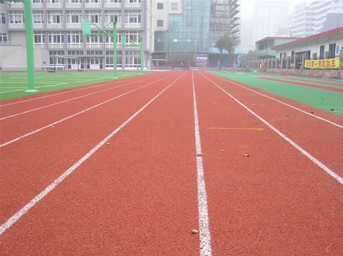 EPDM透氣型塑膠跑道, 首先需對(duì)水泥基礎(chǔ)進(jìn)行防水處理或?yàn)r青基礎(chǔ)進(jìn)行封底處理。待基礎(chǔ)層處理完畢保養(yǎng)24小時(shí)后即可攤鋪跑道底層,用3-4mm的高彈性橡膠黑色再生膠粒加入相對(duì)比例的聚氨酯粘接膠水,攪拌均勻倒入場(chǎng)地,刮耙刮平,鋪設(shè)厚度8mm,固化保養(yǎng)24小時(shí)。用2-3mm的EPDM跑道面層材料加聚氨酯粘接劑攪拌均勻后倒入施工場(chǎng)地,刮耙刮平,用鐵板或者機(jī)械壓實(shí),平整度達(dá)到國(guó)家標(biāo)準(zhǔn),特殊花紋設(shè)計(jì)、耐磨防滑,一體成型面層,厚度均勻,不掉顆粒,不鼓泡,耐老化,色彩鮮艷,在水泥基礎(chǔ)上鋪裝最佳