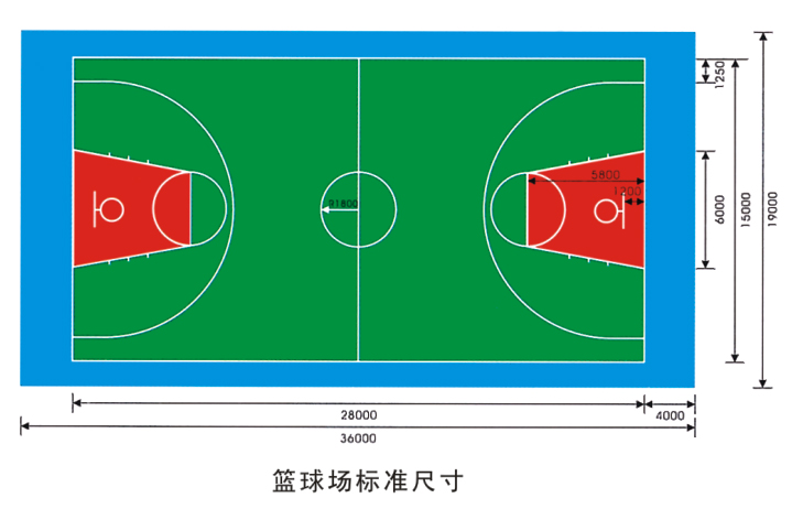在建造籃球場地時,球場區(qū)域要達到28×15m(包含副場32×18),再加上周圍區(qū)域,總面積要達到32.1×22.1m或18m(18m為最小寬度)。這樣的場地可以適應各種地方級的比賽。如果利用現(xiàn)有籃球場地進行各級別的國內(nèi)比賽,場地的長度和寬度都可以根據(jù)實際情況比標準小一些,但是不能太多;場地長度最多可縮小4m,寬度最多可縮小2m,而且場地長度和寬度必須成比例(2:1)的縮?。ɡ缈偯娣e可縮小為26×14m)。按照歐洲籃球聯(lián)盟修改后的規(guī)則,對于26×14m的場地,如果籃扳和支架是固定設置的,在球場長度不變的情況下,球場寬度可放大到15m。